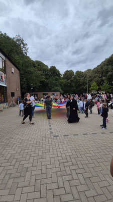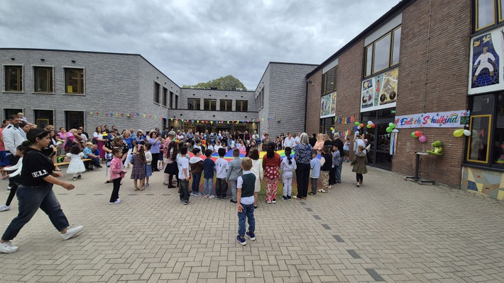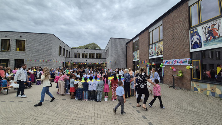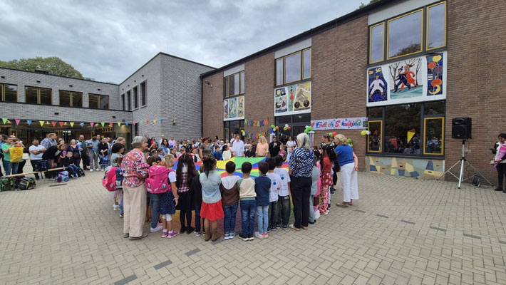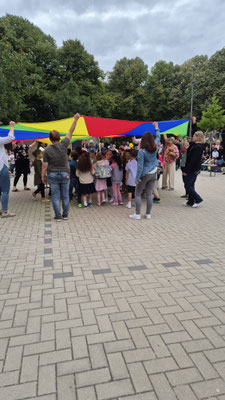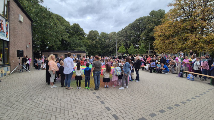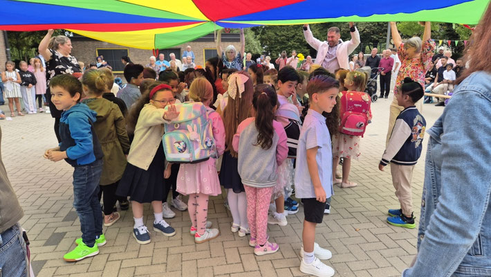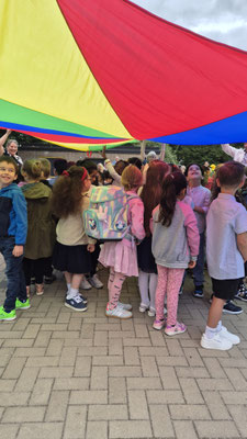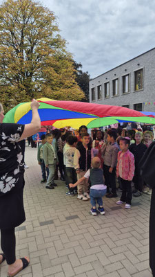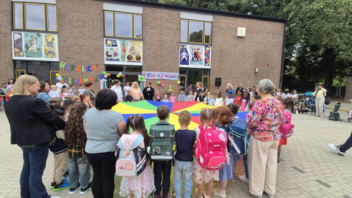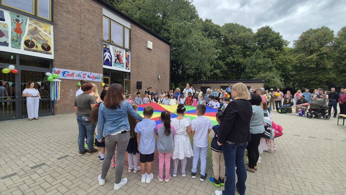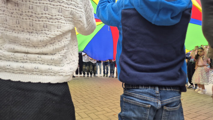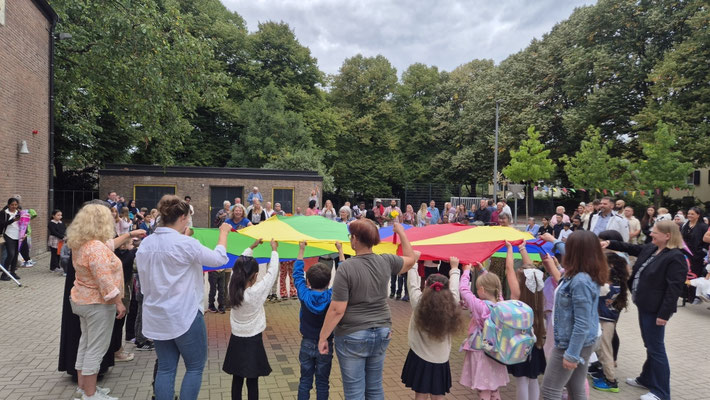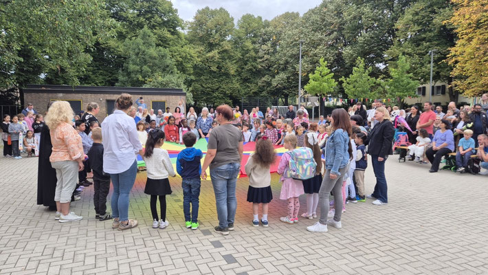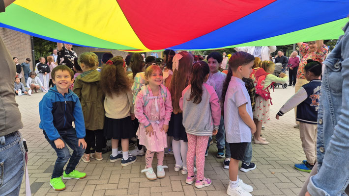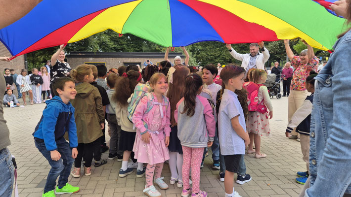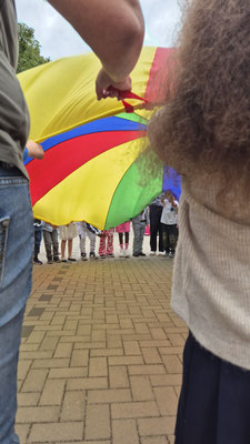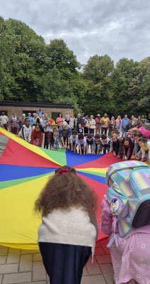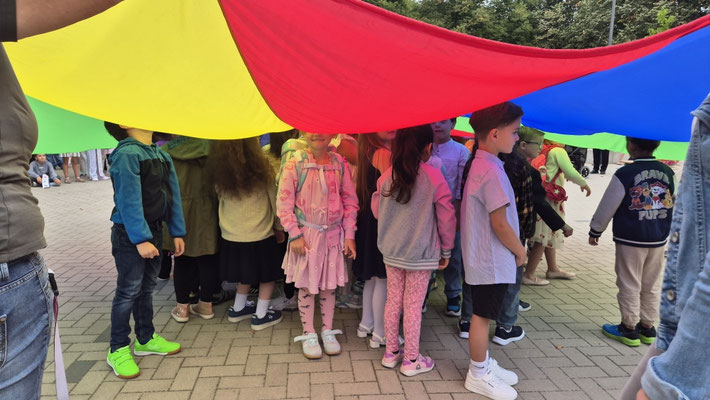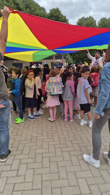 Ein buntes Schwungtuch stand dabei sinnbildlich für unsere Schulgemeinschaft: wie ein schützender Schirm, der Geborgenheit gibt, und auch ein Symbol für das Miteinander und die Freude, die wir teilen.